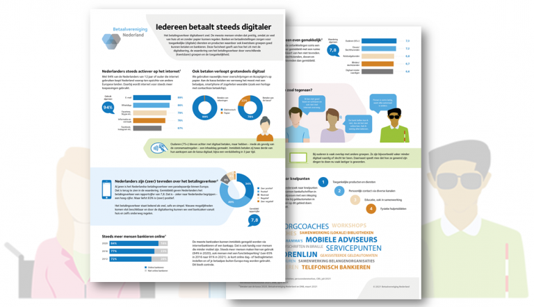 Het betalingsverkeer digitaliseert snel. De meeste mensen vinden dat prettig, omdat ze veel van huis uit en zonder papier kunnen regelen. Banken en betaalinstellingen zorgen voor toegankelijke (digitale) diensten en producten waardoor ook kwetsbare groepen goed kunnen betalen en bankieren. Deze infographic laat zien hoe het gaat met digitalisering en toegankelijkheid van het betalingsverkeer. Deze infographic is ook te beluisteren. En lees ook over wat de banken doen in het kader van toegankelijkheid. Bekijk tot slot de laatste aflevering van betaalTV over de toegankelijkheid van het betalingsverkeer.