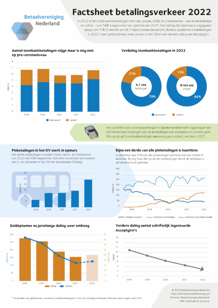 In 2022 liet het totale aantal betalingen in Nederland met cash, pinpassen, iDEAL en creditkaarten, zowel aan de toonbank als online, een stijging van 16% ten opzichte van 2021 zien. Het bedrag dat hiermee is uitgegeven, is met 11% gestegen tot bijna €282 miljard. Toonbankbetalingen hebben vorig jaar een inhaalslag gemaakt ten opzichte van online betalingen, met een stijging van 18%. Online betalingen stegen met 7%. Kaartloos betalen via smartphone of smartwatch wordt steeds populairder en was in december 2021 bij 30% van alle pinbetalingen het geval. Het aantal pinbetalingen in het openbaar vervoer is in 2022 met 65% gestegen, dankzij de invoering van in- en uitchecken met betaalkaarten. Het aantal geldopnames bij geldautomaten is ook toegenomen met 8% en het bedrag dat is opgenomen is met 13% gestegen.