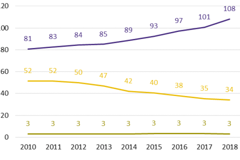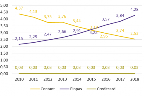 Tussen 2017 en 2018 is het aantal contante betalingen door consumenten in winkels, horecagelegenheden, benzinestations, op de markt en bij dienstverleners afgenomen van 2,74 miljard betalingen (met een waarde van EUR 35 miljard) naar 2,53 miljard betalingen (met een waarde van EUR 34 miljard). Het aantal pinbetalingen is in deze periode gestegen van 3,84 miljard betalingen (met een waarde van EUR 101 miljard) naar 4,28 miljard betalingen (met een waarde van EUR 108 miljard). Het toegenomen gebruik van de pinpas komt mede doordat consumenten op steeds meer locaties, zoals in de horeca en op de markt, kleine bedragen contactloos betalen met hun pinpas. De stijging van pinnen is het sterkst bij bedragen tot EUR 5, terwijl er nauwelijks verandering is bij bedragen vanaf EUR 50.