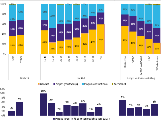 In 2018 betaalden consumenten in Nederland 37% van hun aankopen in winkels, horeca en dergelijke met contant geld en 63% met hun pinpas terwijl zij in 2017 41% van hun aankopen contant afrekenden.