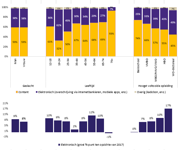 55 – 64 jarigen betaalden in 2018 68% van hun onderlinge transacties met contant geld en 29% elektronisch. Bij hen is de toename van elektronisch geld overmaken naar anderen het hoogst van alle leeftijdsgroepen (+ 12 procentpunten). Het gebruik van op elektronische wijze geld overmaken is overigens het sterkst gegroeid onder academici (+ 17 procentpunten).