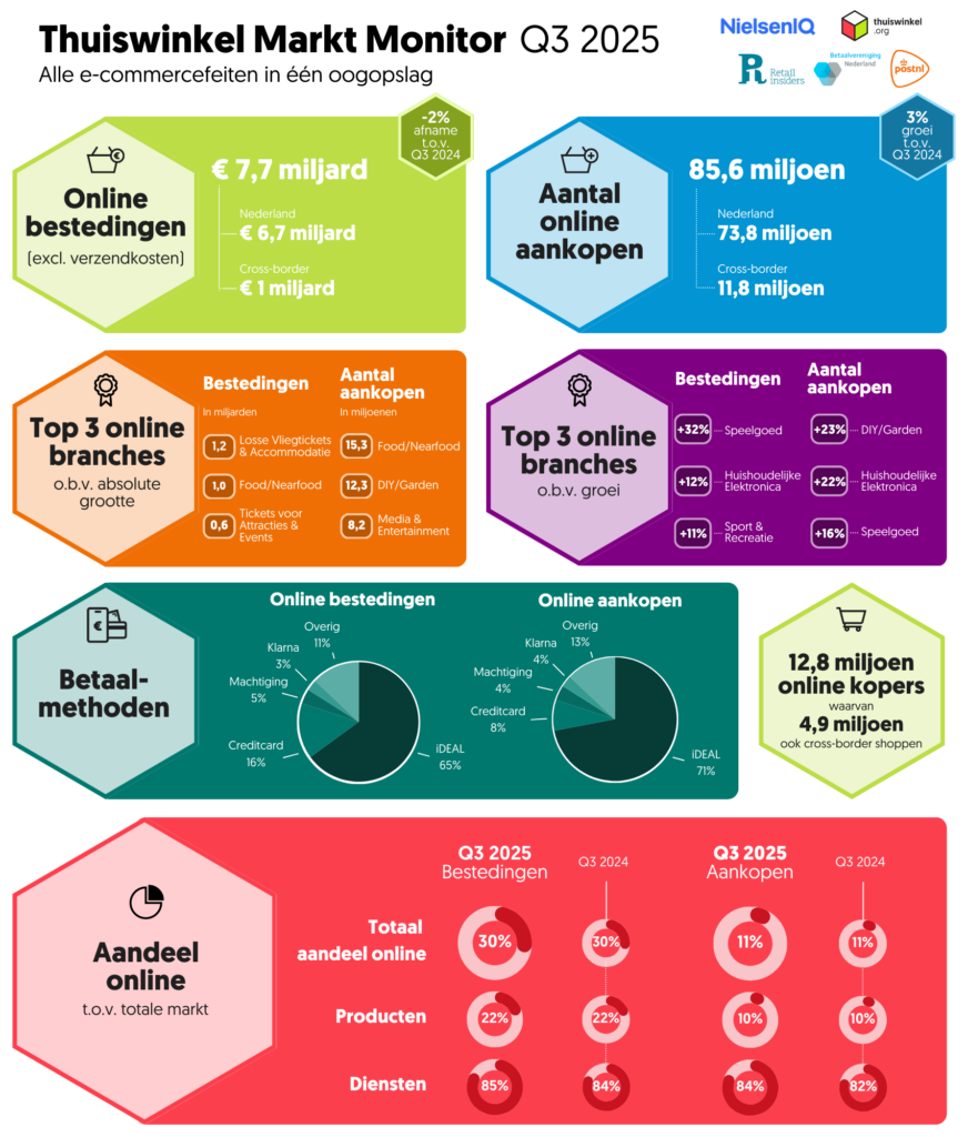 Nederlandse consumenten hebben in het derde kwartaal van 2025 € 7,7 miljard online uitgegeven, 2% minder dan in dezelfde periode vorig jaar. Het aantal online aankopen is met 3% gestegen naar 86 miljoen. Het aandeel aankopen via smartphone is gestegen naar 43%. Daarmee is het aandeel nu gelijk aan dat van laptop en desktop. Dit blijkt uit de nieuwste cijfers van de Thuiswinkel Markt Monitor, het onderzoek naar online consumentenbestedingen in Nederland. Dit onderzoek wordt uitgevoerd door NielsenIQ (NIQ) in opdracht van Thuiswinkel.org en Retail Insiders en in samenwerking met PostNL en Betaalvereniging Nederland.