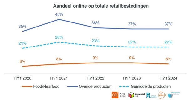 Het online aandeel totale bestedingen en aankopen (ten opzichte van fysiek) blijft gelijk. Marlene ten Ham, Algemeen Directeur van Thuiswinkel.org, zegt hierover: “Sinds de coronapandemie zien we dat de Nederlandse consument gewend is geraakt aan online winkelen, maar het verschilt per categorie of ze liever online kopen of liever naar de fysieke winkel gaan. Voornamelijk diensten worden online aangeschaft, bij producten ligt dat percentage lager. Het aandeel online bij producten wordt echter sterk beïnvloed door de categorie Food/Nearfood (o.a. supermarkten): slechts 8% van de uitgaven aan Food/Nearfood vindt online plaats. Dit haalt het gemiddelde percentage naar beneden. Zonder Food/Nearfood geeft de consument 37% van zijn retail bestedingen aan producten online uit.”
