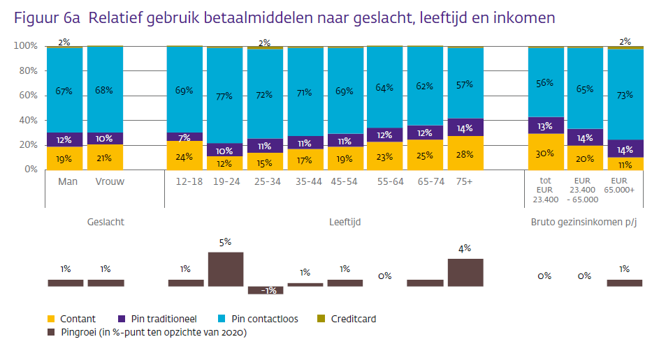 Nederlanders met een relatief laag inkomen betalen het meest met contant geld. Zij geven vaker dan anderen aan dat het gebruik van contant geld een beter beheer van hun uitgaven mogelijk maakt dan pinbetalingen. Voorheen waren Nederlanders van 75 jaar en ouder de groep die het vaakst contant geld gebruikten, maar het cashgebruik binnen deze groep is in twee jaar tijd gehalveerd naar 28% van de aankopen. Met iets meer dan een op de tien contante betalingen maken mensen uit de hoogste inkomensgroep het minst gebruik van contant geld.