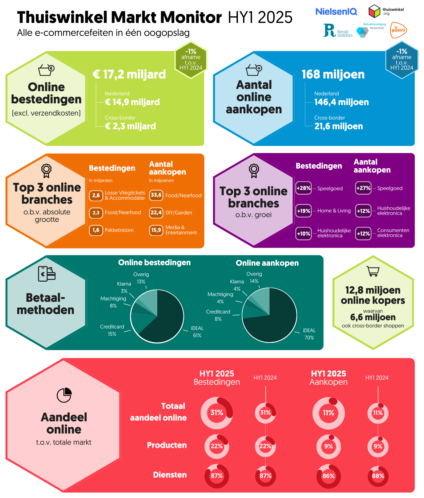 Dutch consumers spent over €17 billion online in the first half of 2025, 1% less than in the same period last year. This decrease is due to declining spending on services (-7%). The total number of online purchases came to 168 million (-1%), of which 144 million were product purchases. The number of purchases of services fell by -12%. This is according to the latest figures from the Thuiswinkel Markt Monitor, the research into online consumer purchases in the Netherlands. The research is conducted by NielsenIQ (NIQ), commissioned by Thuiswinkel.org and Retail Insiders and in cooperation with PostNL and Betaalvereniging Nederland.